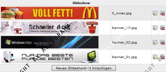 Die Slideshow bietet die Möglichkeit, mehrere Bilde nacheinander einzublenden und mit Links zu versehen. Das bietet sich meist für Coverages, Specials oder sonstige Dinge an, die man auffallend präsentieren will. Die Slideshow wurde mittels Javascript realisiert, die Bilder können bequem übers Adminmenu bearbeitet werden. Dir Größe der Bilder und die Position der Seitenzahlen können via CSS definiert werden.
